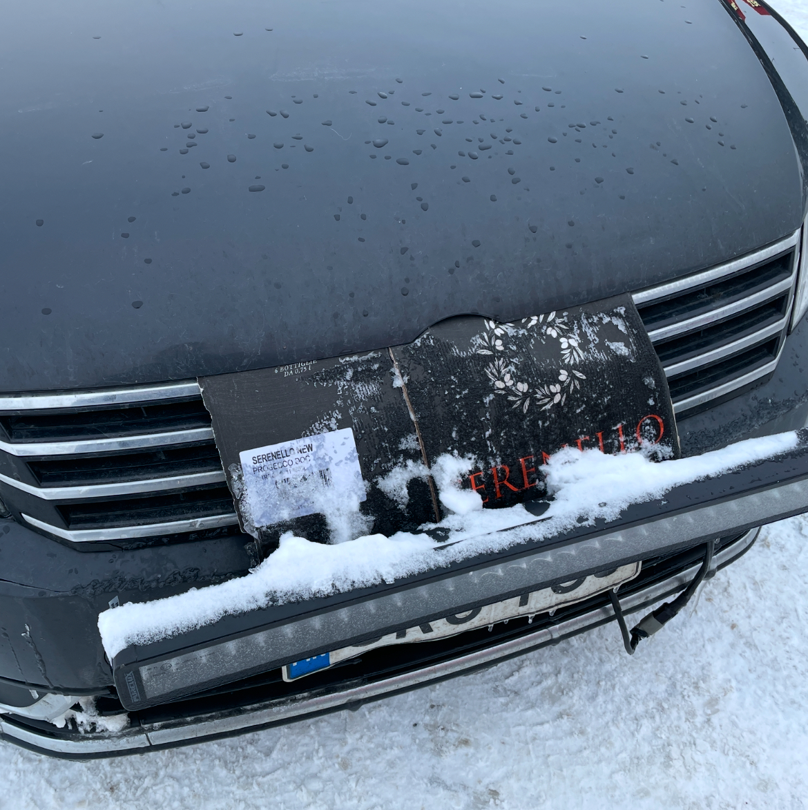 "description": "Tuttu näky talvisessa Lapissa, auton keulaan moottorin eteen on laitettu, käpistelty, pahvin palasta suoja pitämään auto pakkasilla ajaessa lämpimämpänä ja että auto lämpenisi nopeammin. Pellolainen Marko Vaaraniemi on tehnyt viinilaatikosta maskipeiton lämpöä tuomaan. Juha Mäntykenttä on autoasian ja lappilaisen innovaation ja designin äärellä.\n\nKuva: Juha Mäntykenttä. Maskipeiton design by Marko Vaaraniemi Pello",