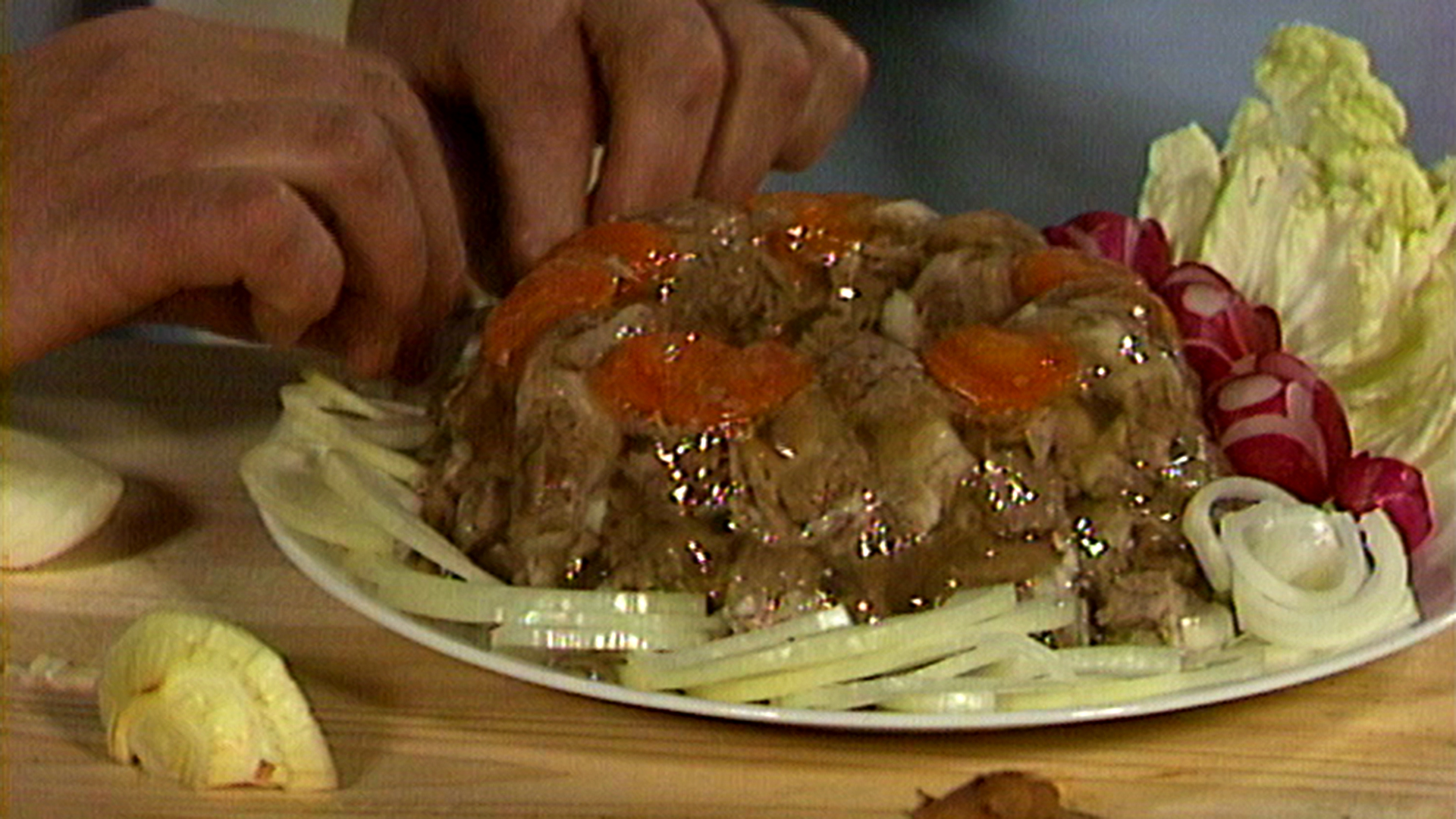 } Card Lihahyytelöä ja sisäfilepihvejä juottovasikasta Description: Jaakko Kolmonen ja Sirkka Gustafsson valmistavat lihahyytelöä ja sisäfilepihvejä juottovasikasta. Perinneruokaesittelyssä renkolainen talkkuna ja makkarus. Haastateltavina renkolainen Raija Valaja ja professori Eero Remes Kuopion yliopistosta. (2.2.1988) Card JSON{
