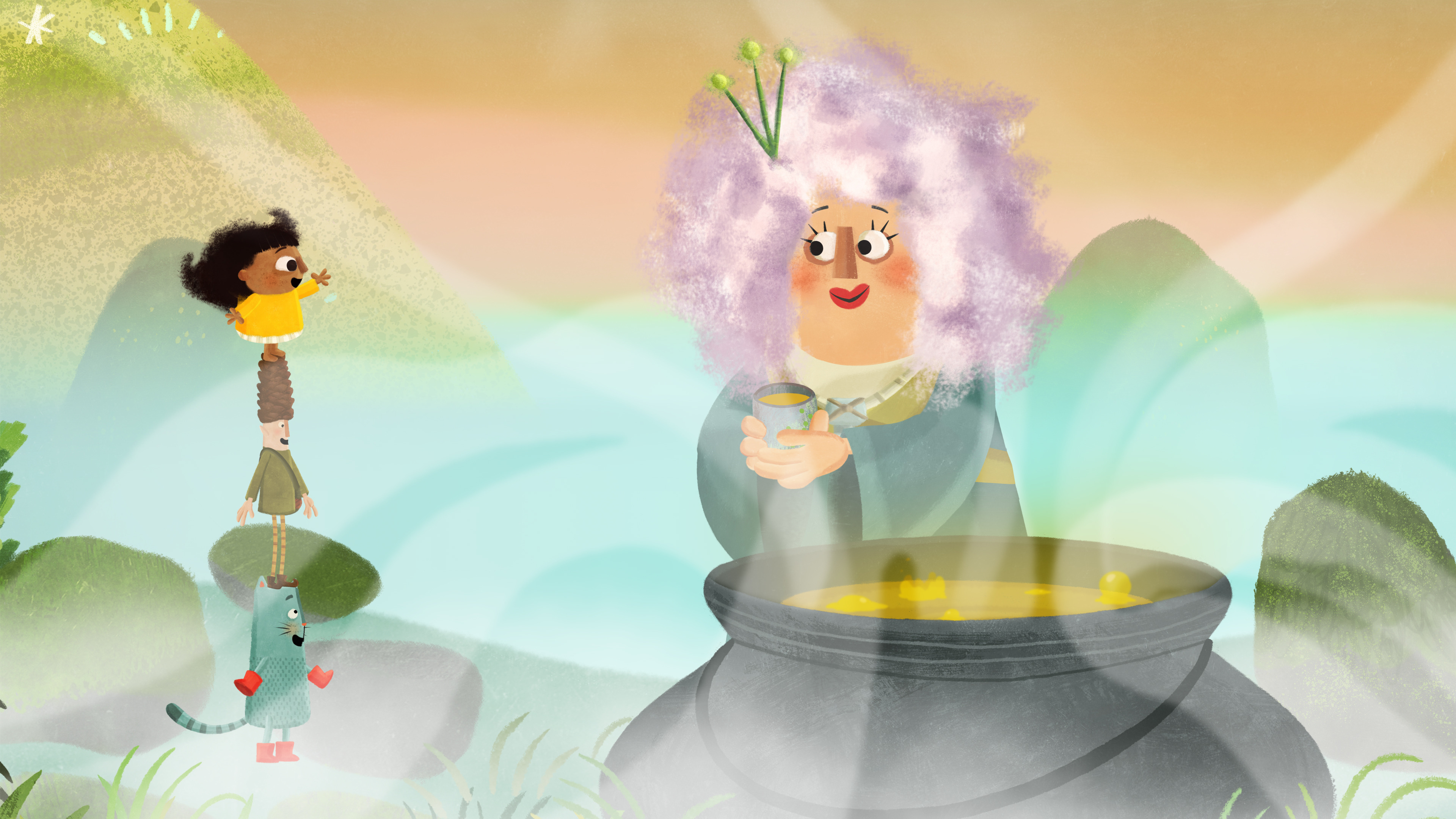 "description": "Ulkona on sumuista. Ystävykset lentävät tapaamaan Sumurouvaa, joka tarjoilee keittämäänsä herkullista juomaa.",