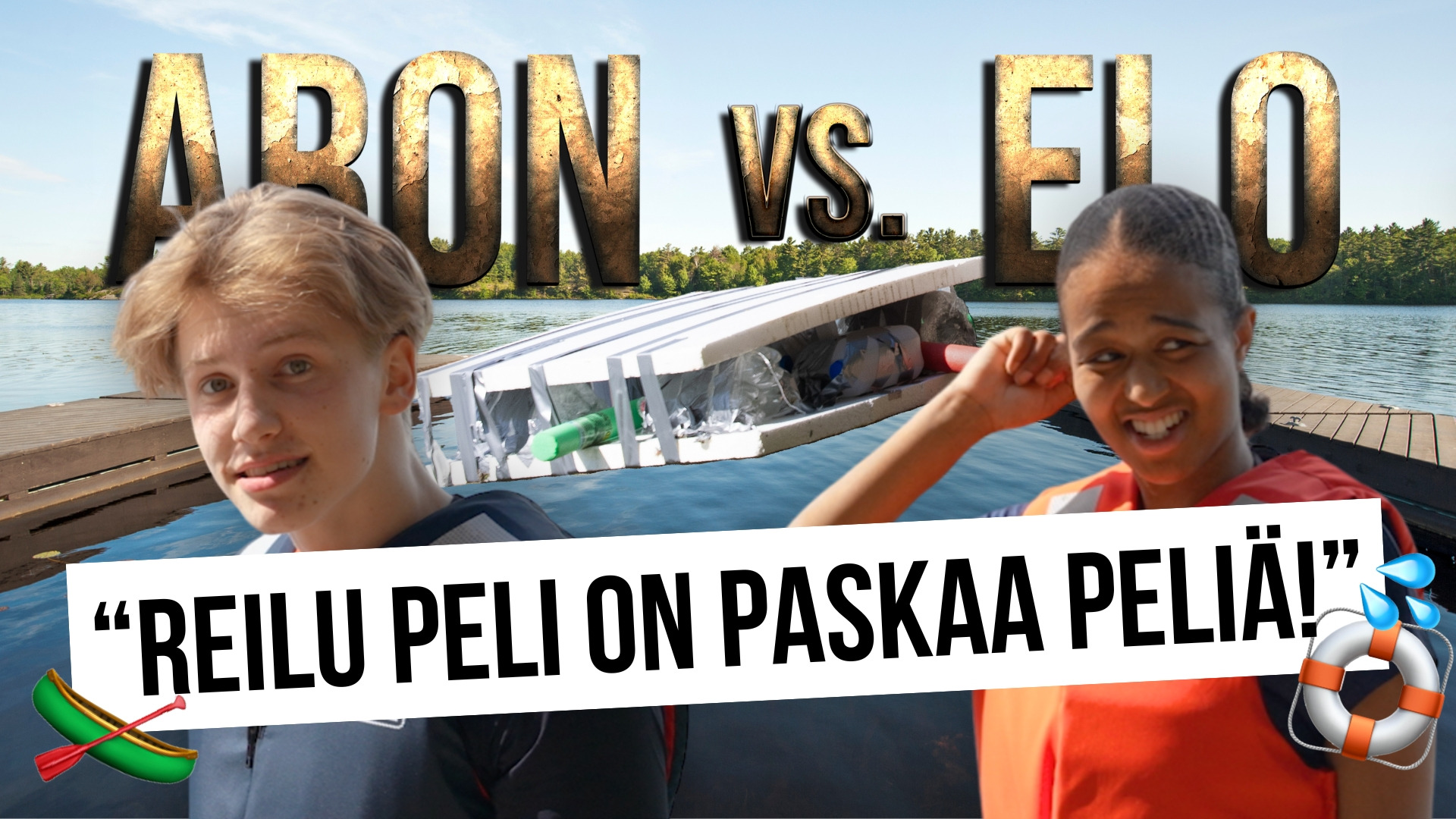 "description": "Aronilla ja Elolla on päivä aikaa rakentaa lautta ja ylittää vesistö omin voimin. Saako muovipulloista kyhättyä kelluvaa alusta? Entä kumman lautta joutuu vastustajan sabotoinnin kohteeksi? Mysteeribokseista paljastuu ikäviä yllätyksiä, kun ylösalaisin-lasit ja lisäpaino astuvat kuvioihin. Haasteen päätteeksi häviäjä saa kylmää kyytiä - kirjaimellisesti.",